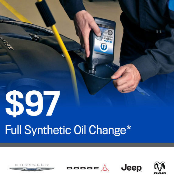 *$97 Full Synthetic Oil Change. Offer valid on oil replacements of full synthetic oil, oil filter and fluid level inspection. Qt limitations may apply. Must present the original coupon upon arrival for initial service. Offer valid at participating FCA US LLC dealers only. Not valid with other offers. Customer is responsible for local tax and Shop Supplies fee. See Service Advisor for complete details Valid at Gossett Chrysler Dodge Jeep Ram FIAT. Offer expires ##date##.