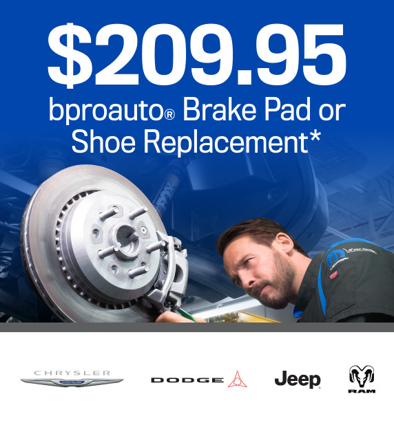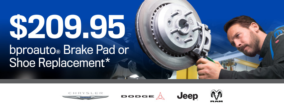 *$209.95 bproauto Brake Pad or Shoe Replacement. Front or rear disc brake pad or shoe replacement with bproauto Brakes. Inspect rotor, drum and caliper (refacing/machining extra). Check brake fluid level. Road test vehicle. Some vehicles may be higher. Must present the original coupon upon arrival for initial service. Valid for most makes and models. Customer is responsible for local tax and Shop Supplies fee. Valid for most makes and models. See Service Advisor for complete details. Valid at Shottenkirk Chrysler Dodge Jeep Ram Prosper. Offer expires ##date##.