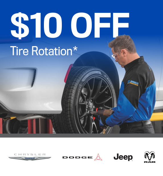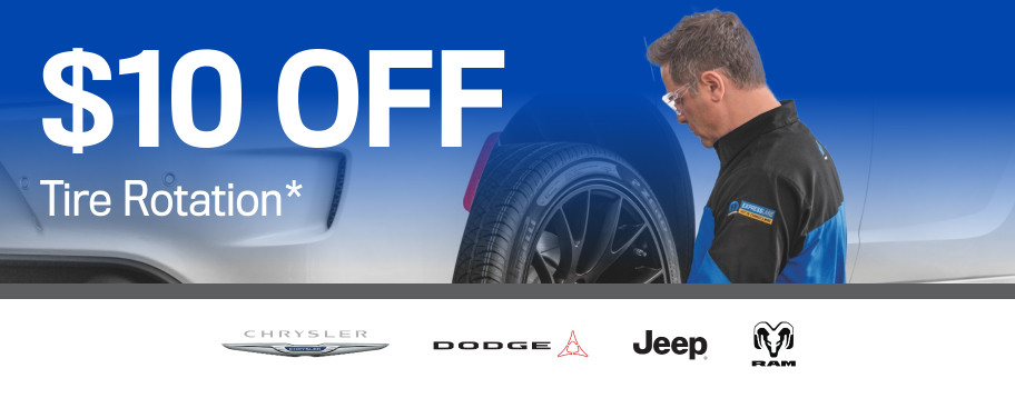 *$10 Off Tire Rotation. Please present coupon at time of write-up. Cannot be redeemed for cash value. Other exclusions may apply. Customer is responsible for local tax and Shop Supplies fee. Valid for most makes and models. See Service Advisor for complete details. Valid at Shottenkirk Chrysler Dodge Jeep Ram Prosper. Offer expires ##date##.